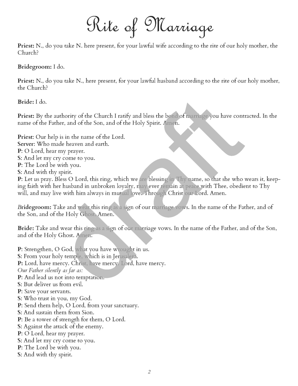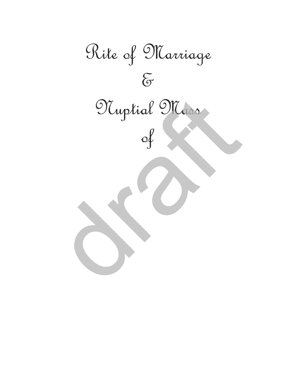 A 4-page PDF program for a traditional Catholic wedding, including the Rite of Marriage (English) and the propers from the wedding Mass (Latin and English). There are two fillable fields on the first page, for the couple's name, and for the date and location.