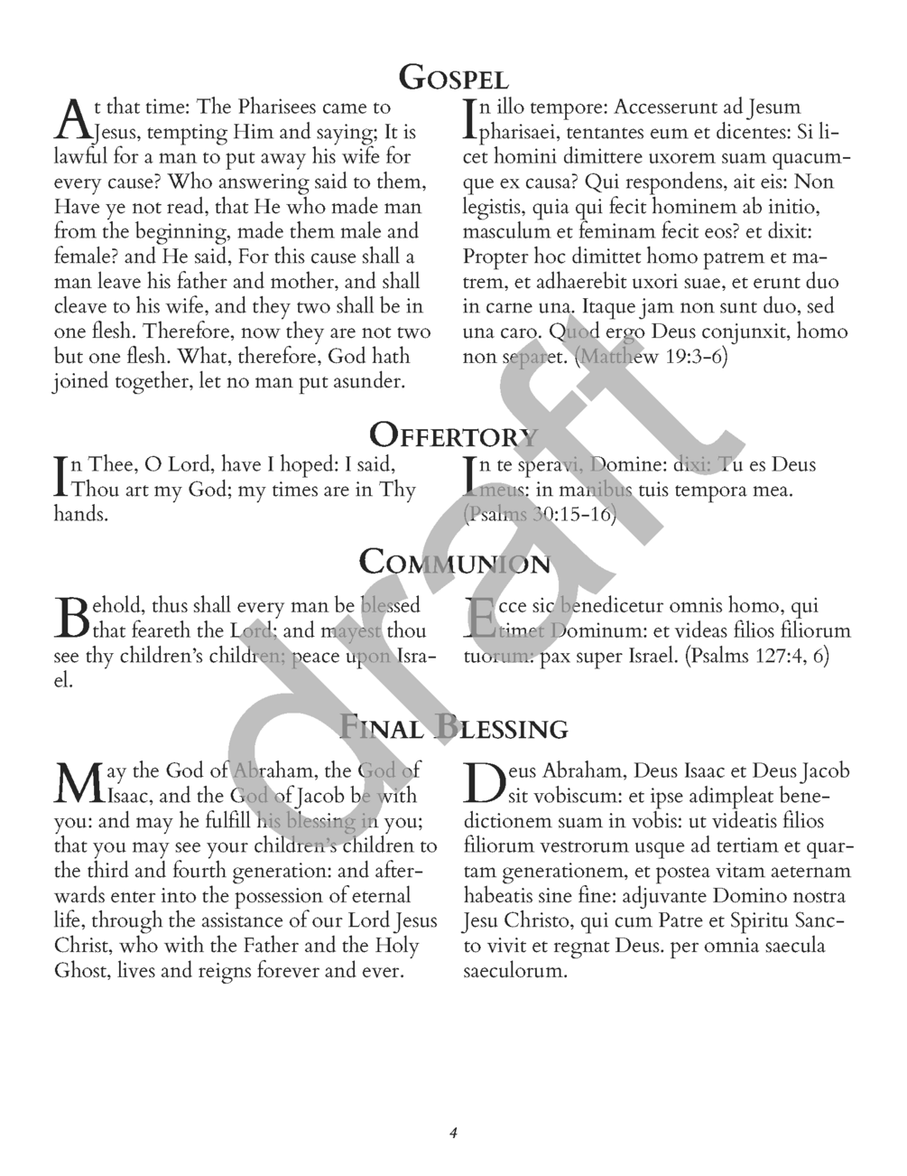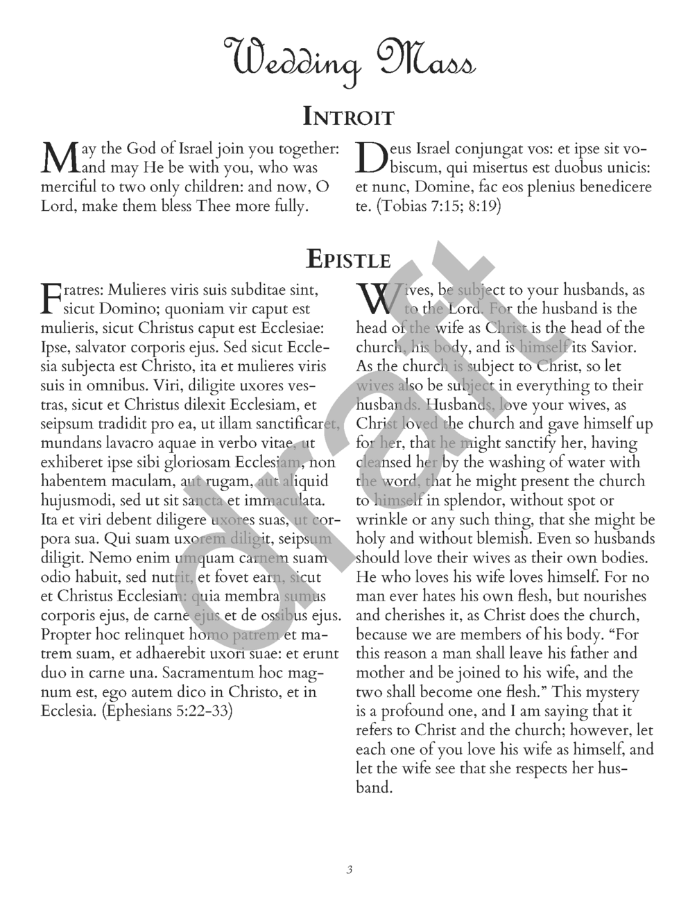 A 4-page PDF program for a traditional Catholic wedding, including the Rite of Marriage (English) and the propers from the wedding Mass (Latin and English). There are two fillable fields on the first page, for the couple's name, and for the date and location.